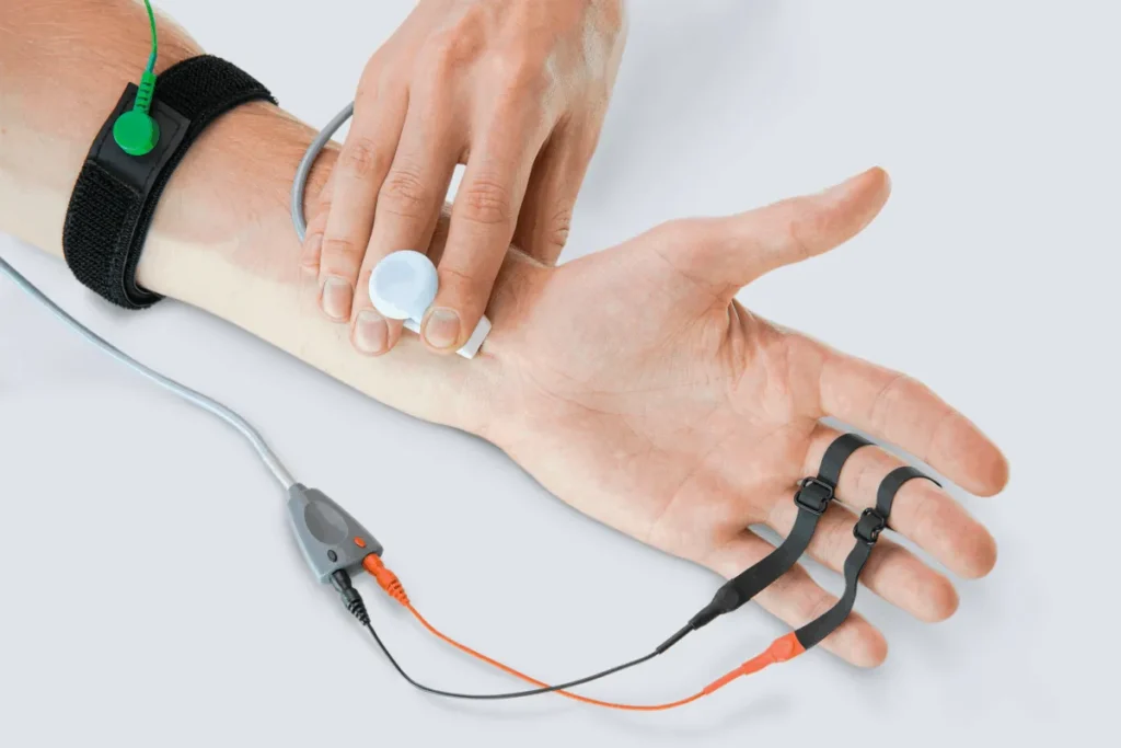 Je trekt de spier samen en ontspant hem om de activiteit te meten.
